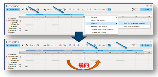 在制作裝配動(dòng)畫的時(shí)候,一般都是先制作拆的動(dòng)作,然后反轉(zhuǎn)。很多時(shí)候,反轉(zhuǎn)之后,要做很多關(guān)鍵幀的調(diào)整,不然會(huì)有錯(cuò)亂。