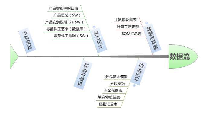 最終形成產(chǎn)品的材料明細(xì)表、總裝模型、加工圖紙、零部件工藝卡等。再交由包裝設(shè)計(jì)人員進(jìn)行分包設(shè)計(jì),形成分包模型、包裝BOM、五金包圖紙、填充物明細(xì)表等設(shè)計(jì)數(shù)據(jù)。最后交由數(shù)據(jù)定額人員,制作最終的產(chǎn)品BOM以及編制工藝定額。